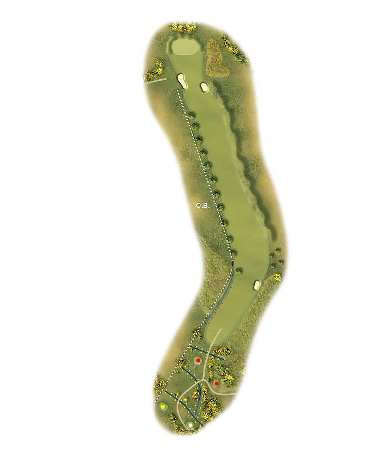 A challenging opening hole, the ladies tee is 30yds ahead of the mens. But an easier hole second time around for the men with the yellow tee forward. The fairway is slightly undulating and at each side of the fairway there are lateral water hazards. On the left is out of bounds, and on the right the grassed ditches can sometimes be played out of. Further along on the right there is a water hazard surrounded by trees. With luck a shot to the green is often possible from here. There's a shallow swale in front of the green with steep run-off grass banks to the left and beyond.